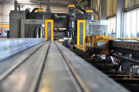 Eine computergesteuerte Säge/Bohr-Straße für Stahl ermöglicht mehrere Bearbeitungsschritte der Quadratrohrstützen in einem Arbeitsgang.